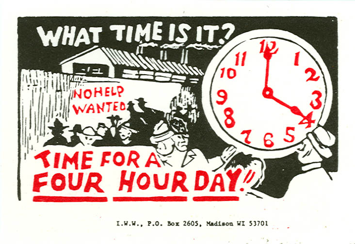 Eventually, Anarchist and Socialist worker movements cut down those hours to 8, compelled governments to pass laws about overtime and lunch breaks (which, by the way, don’t matter if you work for most small restaurants, not because of the law but the impossibility of getting agencies to actually do something about it). But even 40 hours isn’t just 40 hours–time spent getting to work, getting home for work, preparing for work, unwinding from work, looking for work, worrying about work—there’s no full accounting of such time, or what else is spent at work.