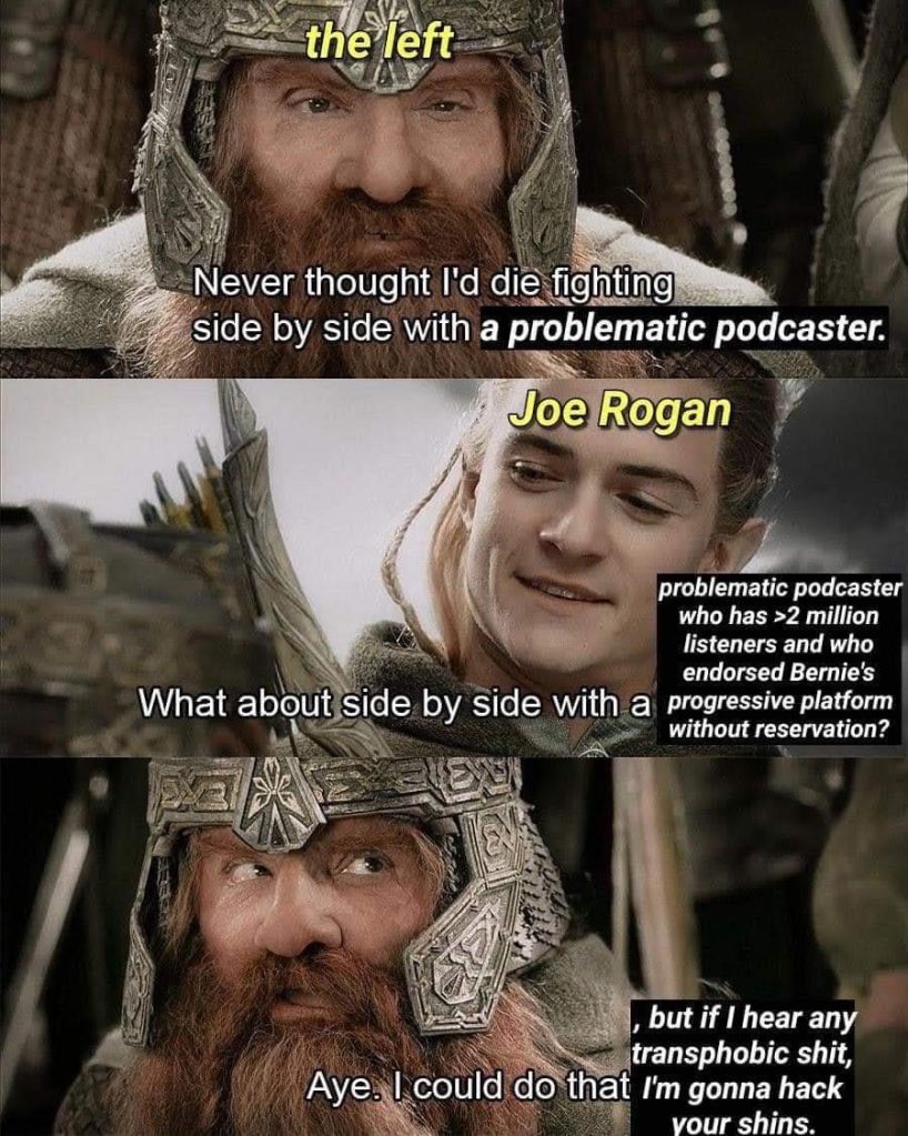 Anyway, Joe Rogan has interviewed (hosted) fascist-aligned people who believe we need to depopulate the earth and round up trans people and Muslims, along with many other boring guests. And he says racist stuff occasionally, and holds some stupid ideas that we generally would identify as just a few steps (or a drunken stumble) from far-right, fascist ideology. And so people, especially those who’ve created careers for themselves as standing up for people with oppressed identities (the Human Rights Campaign, for example, who’s also thrown their lot in with corporate media conglomerates), are quite livid. So are, especially, Democratic Party establishment types, who are quite appalled at the idea a candidate with a left-leaning platform (Sander’s barely a socialist by European standards, but for America he’s practically Che Guevera) being able to attract support from “the other side.”